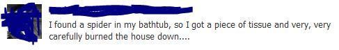 1. hahahaha! I actually am legitimately arachniphobic and I made a complete fool out of myself the other day with my boyfriend. I was in the car and I lifted my left elbow and saw that there was a huge spider (size of a half dollar coin) on my elbow crawling up my arm!!!! I immediately screamed, my boyfriend freaked out because he was driving and then I freaked out and started crying! I NEVER cry so this was a surprise was a shock for both him and I. I screamed at him to get it off me and what did he do? He squished the spider on my, shirt, on my elbow! I started uncontrollably crying at this point and ripped my shirt off and threw it in the back of his car.