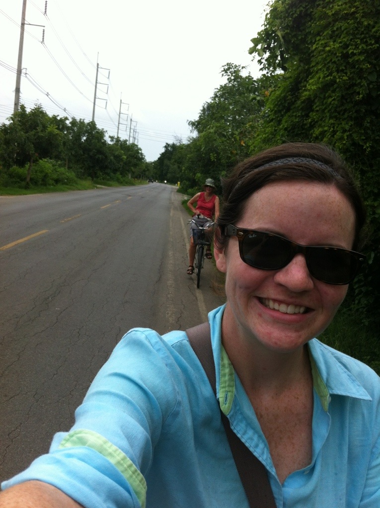 We crossed the river and biked out in the Thai countryside. We were kind of looking for this temple in a cave, but we felt we didn’t have enough time to get there and back. So we just cruised, passed the odd road side stand, saw some farmers working in their race paddies and gardens and cows just hanging out.