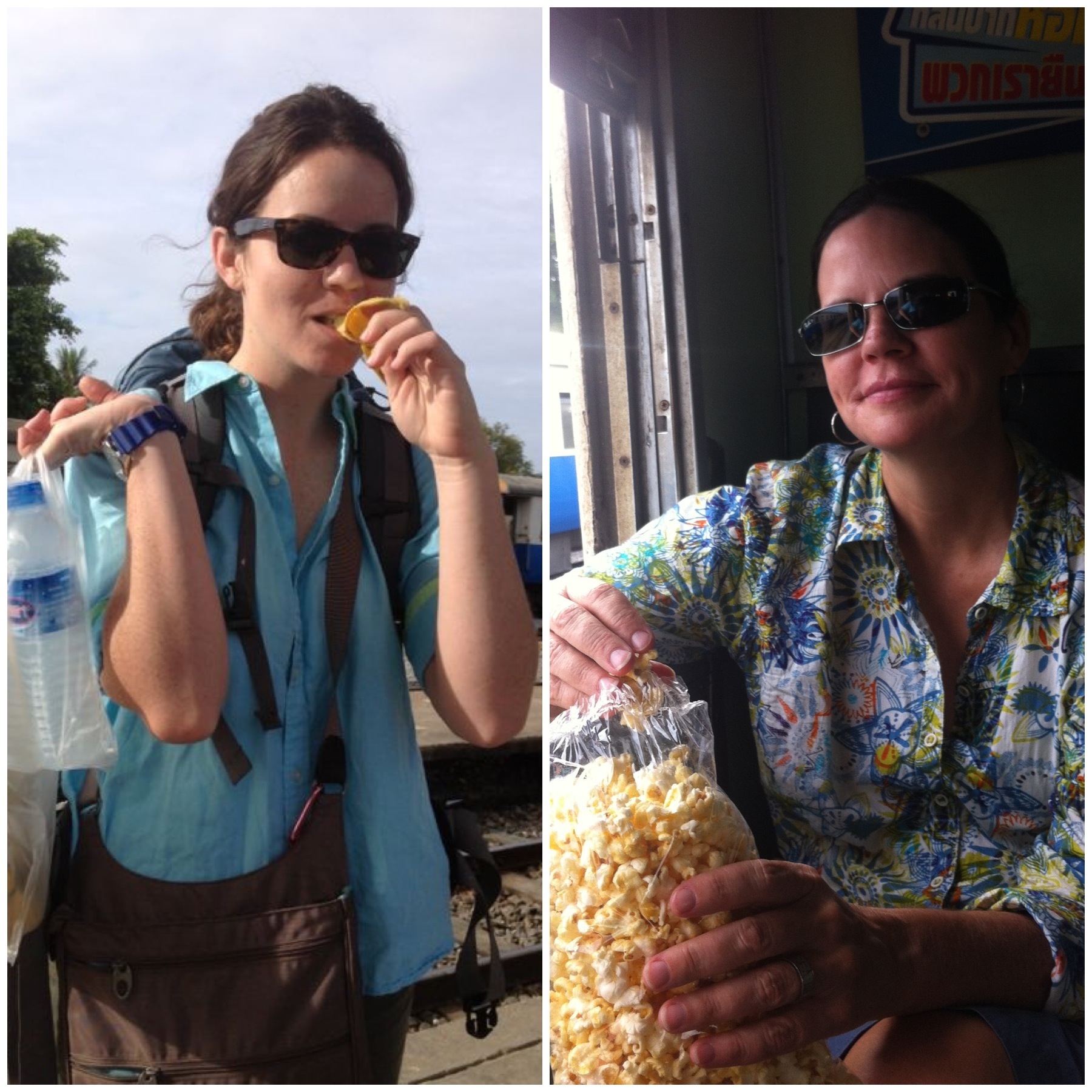 There is a market right next to the station, so we thought we’d do a super quick reconnaissance in search of breakfast food – which is how we ended up with a bunch of mini-bananas and a bag of the most delicious kettle corn I’ve ever had (and I am what you might call a kettle corn connoisseur). We grabbed a Coke and hopped on the train to Kanchanaburi. We also rounded out our morning meal with some slices of pomelo that a vendor who had hopped on the train for a few stops sold us. It was served with this sugar/salt mixture that was pink and tasty.
