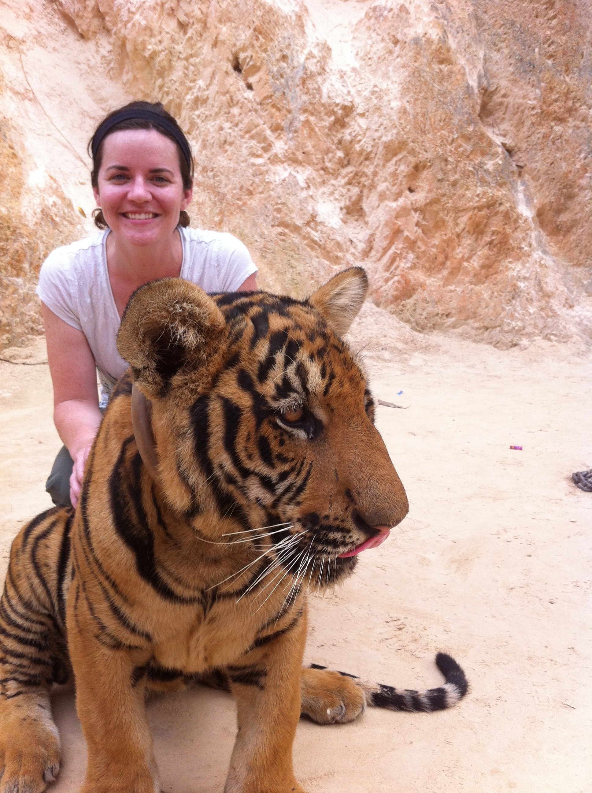 We got down in the canyon on temple grounds. On one side of a fence there were about ten or so tigers, each with a handler-type person, a couple monks hanging out, and a ton of people in lines on the other side. You could pay extra to take a group photo, where you got to hold the biggest tiger’s head in your lap, but we opted for the individual photos included in admission costs. You go in the fence one by one and hand your camera to somebody, and they hold your hand and walk you from tiger to tiger, telling you when and how to pose. For some reason, I actually had two handlers – an older lady who had no interest in making small talk led me around while a disinterested young lady took my pictures and chatted with my hand holder in Thai.