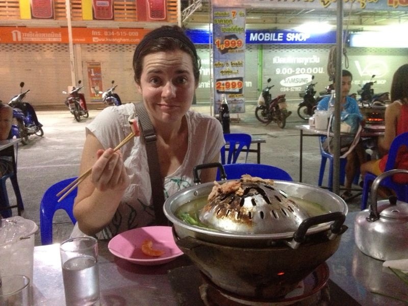 Next we hit the night market. We wandered around trying to make some supper decisions, but couldn’t make up our minds. One obstacle we face is that my mom can’t have gluten/wheat and there are really no universal hand motions for that sort of thing (yet!). Finally we saw some tables under an awning set up on the sidewalk with a sign boasting a buffet of 9.99 Thai Baht (about $3). There was all this uncooked food setting out, and people were loading up plates and taking them back to their table, where a waiter set up a hot pot type thing. It had a fire underneath, a hot water moat and a hot metal dome.