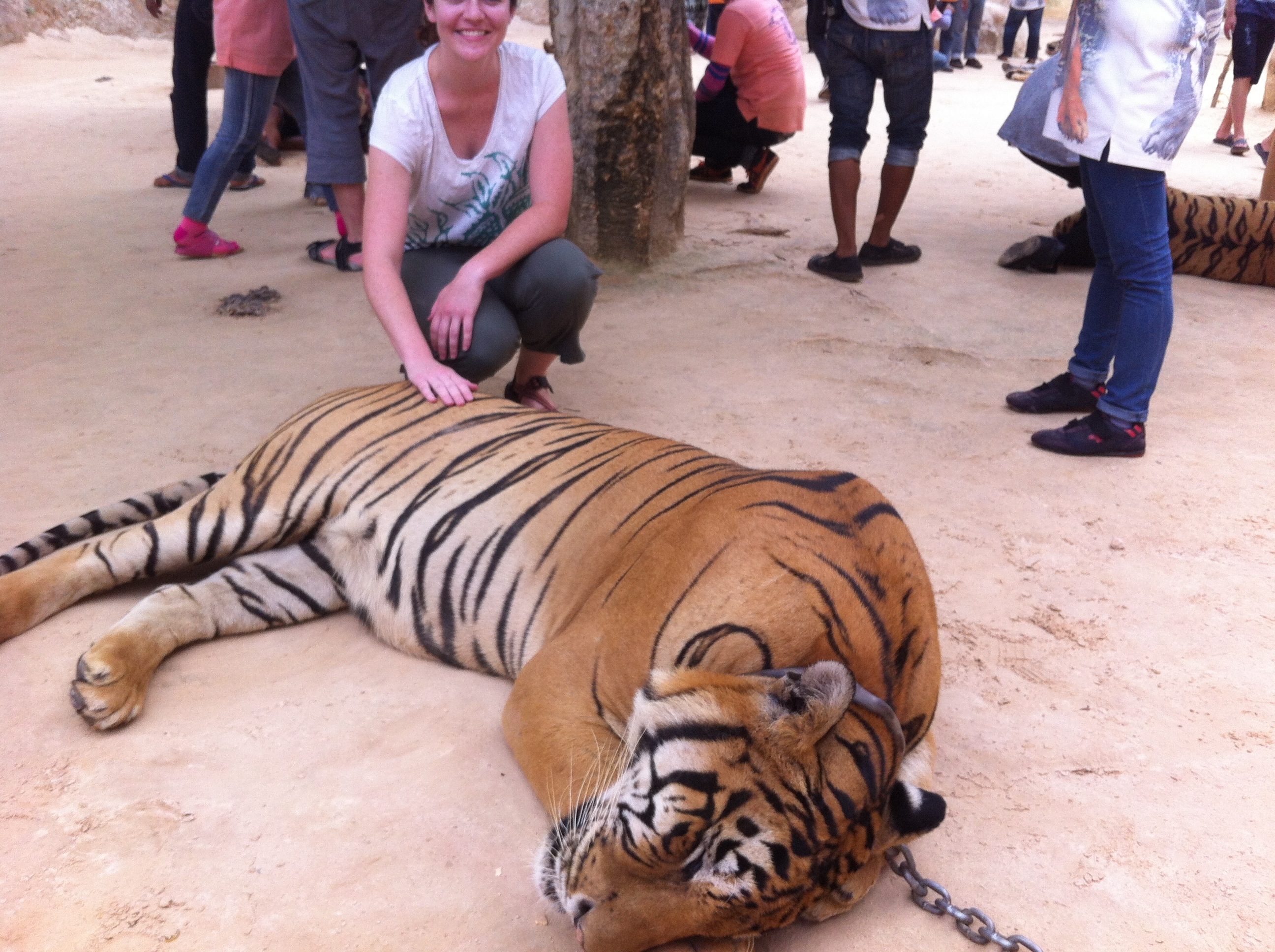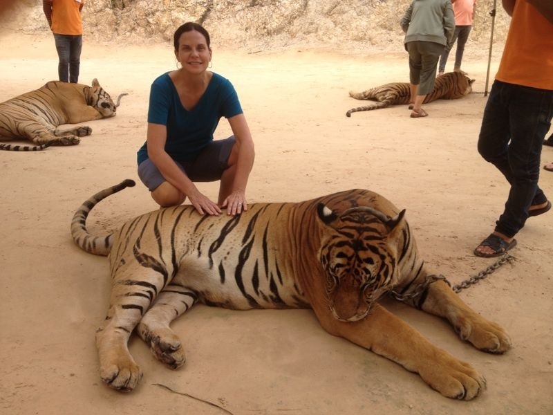 I have mixed feelings about this experience. Because it was a monastery, I thought it would be more about the relationships between the tigers and the monks. It turned out to be little more than a tourist attraction that the monks used to earn money. We heard both that the tigers were drugged and were not, but their lethargic behavior made sense when they were compared to domesticated cats for us by an employee. I am going to go with sober tigers, just hanging out in the hottest part of the day. It was also a little sad to see them shackled to the ground. (Even though a tiny part of me was glad they were chained up when I was in there with them.) Honestly, it felt kind of like a photo-op to cross off a list but I will say I’ve never had the opportunity to get that close to tigers anywhere else – see what I mean? Mixed feelings.