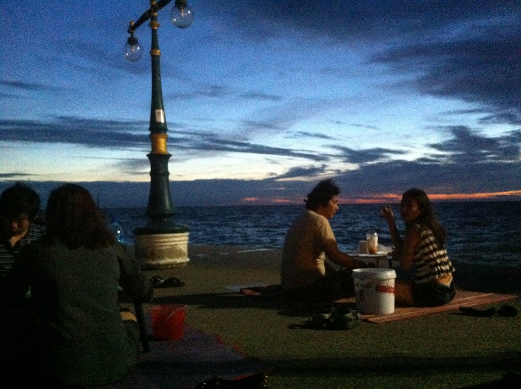 We drove a little further down the road to Bang Sean for a sea side picnic. Koi and Cotton ordered for us from a stand they like to eat from. Each stand had a few of it’s own little tables on mats on a concrete pier right next to the ocean. We took our shoes off and sat on the mat around a two-foot tall table.