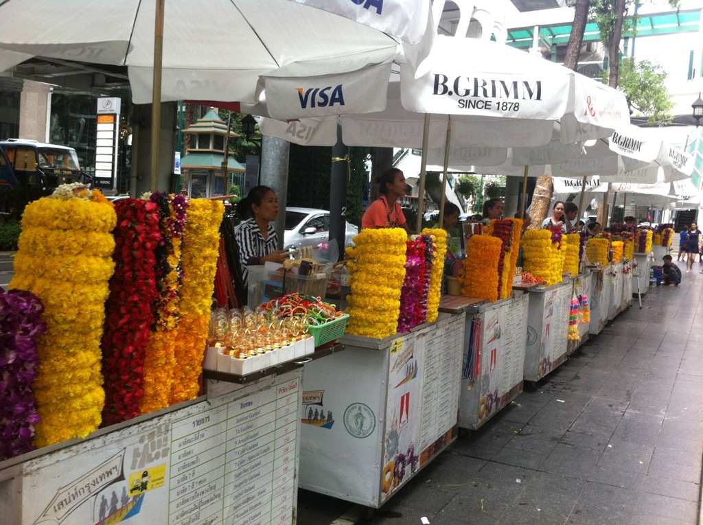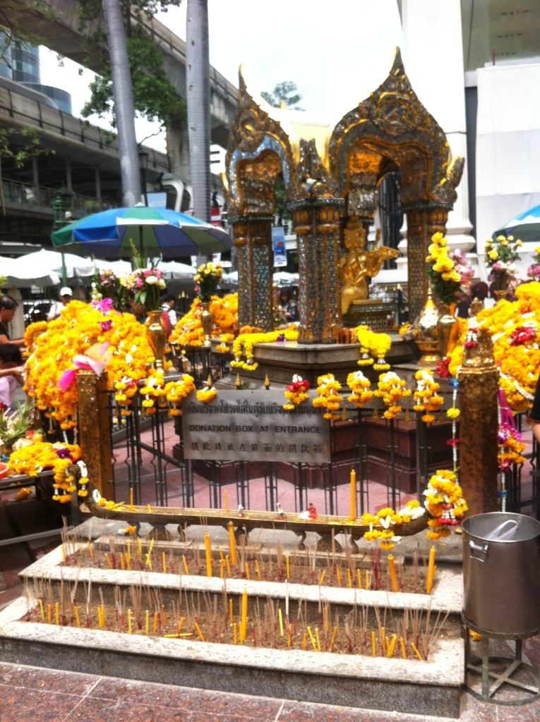 We got up this morning to meet my mom’s cousin, Cotton, had a nice catch up, and then he took us to the Queen-sponsored Thai handicrafts shop (so you know they were made by actual Thai people with Thai material). We also swung by The Erawan Shrine (one of many, many sacred spots in the city), and Cotton explained some of the Buddhist traditions to us. Apparently we were in the middle of a holiday weekend, sort of like a Buddhist version of Lent. We saw people leaving flowers and lighting incense, buying birds and releasing them, and ladyboys dancing. It was, um… different than how we do it in Baptist land.