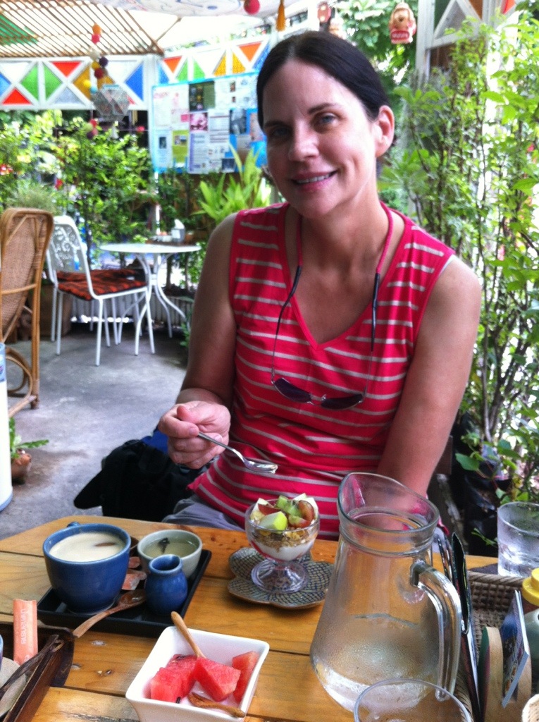 This morning we had breakfast at my new favorite little restaurant. It was called Angel’s Secrets, and I had some fab French toast and tea. Mom had some coffee with a jasmine tea chaser (which apparently is customary in this part of the world) and a delicious fruit parfait. Yum! It was a cute little place, and I recommend it to anybody traveling through Chiang Mai. (They have free WiFi, too.)