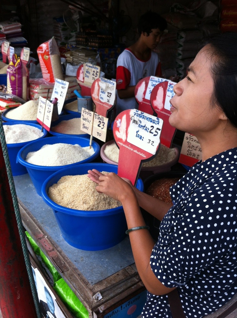 Feeling good, we walked back to our hotel to be picked up by the cooking school we booked a class with. Turns out, we had Tak and Cooking at Home to ourselves! We drove first to a market out of the center/tourist area of town. In a rice shop, she explained to us about how the rice is harvested and how to best use the variations for for cooking.