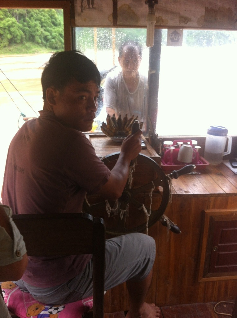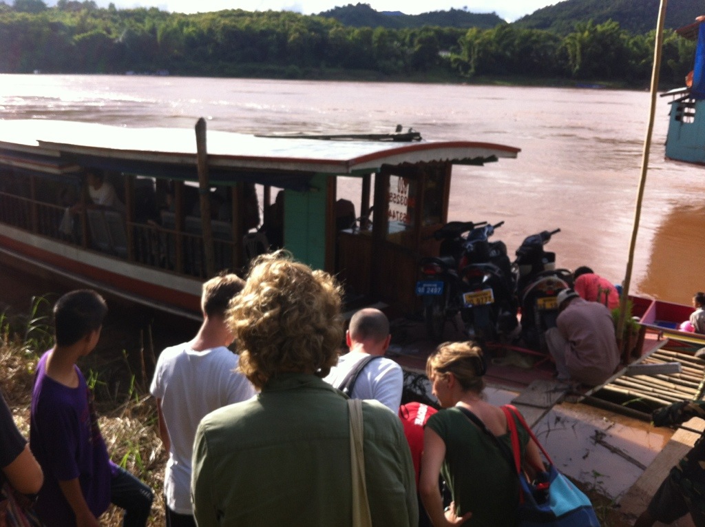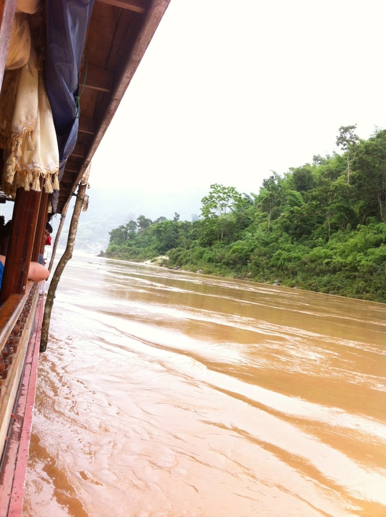 So we cruised down the Mekong for six or seven hours in a slow boat. It was rainy in the morning, but there were tarps to pull down on the side if the rain started blowing in. But it cleared off and got nice – not too hot, beautiful green mountains rising up from the water. The river is a bit muddy, (okay it’s actually chocolate milk muddy) but the clouds rolled by and there was a breeze the whole time.
