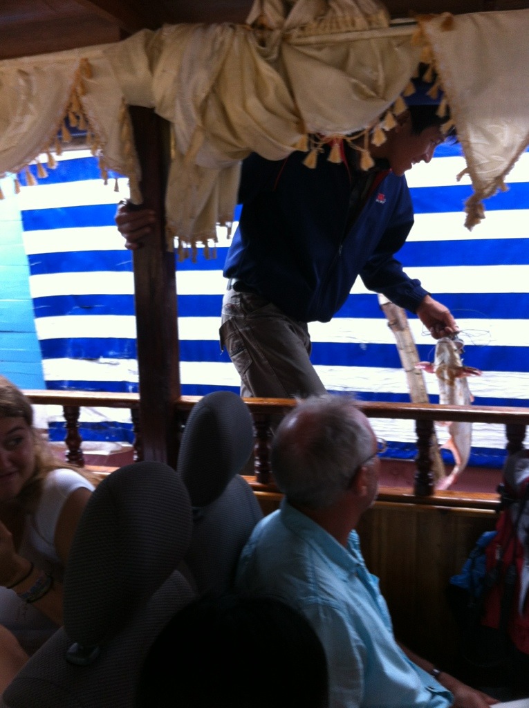 We bought some more snacks, and got ready to hit the road (river?). First we had to wait for extra seats to be lowered in through with the roof to placate some people who would have had to sit on the floor otherwise.