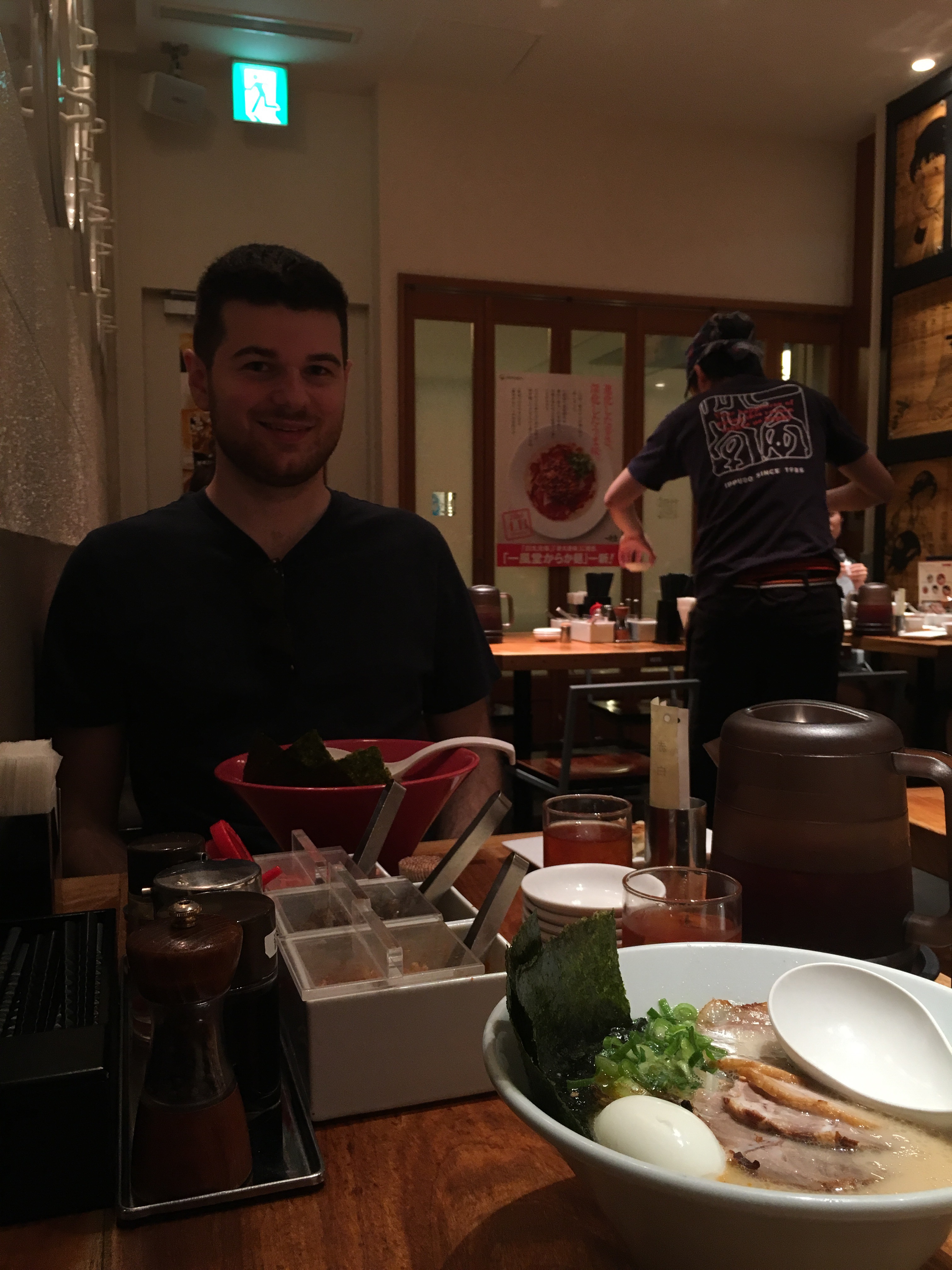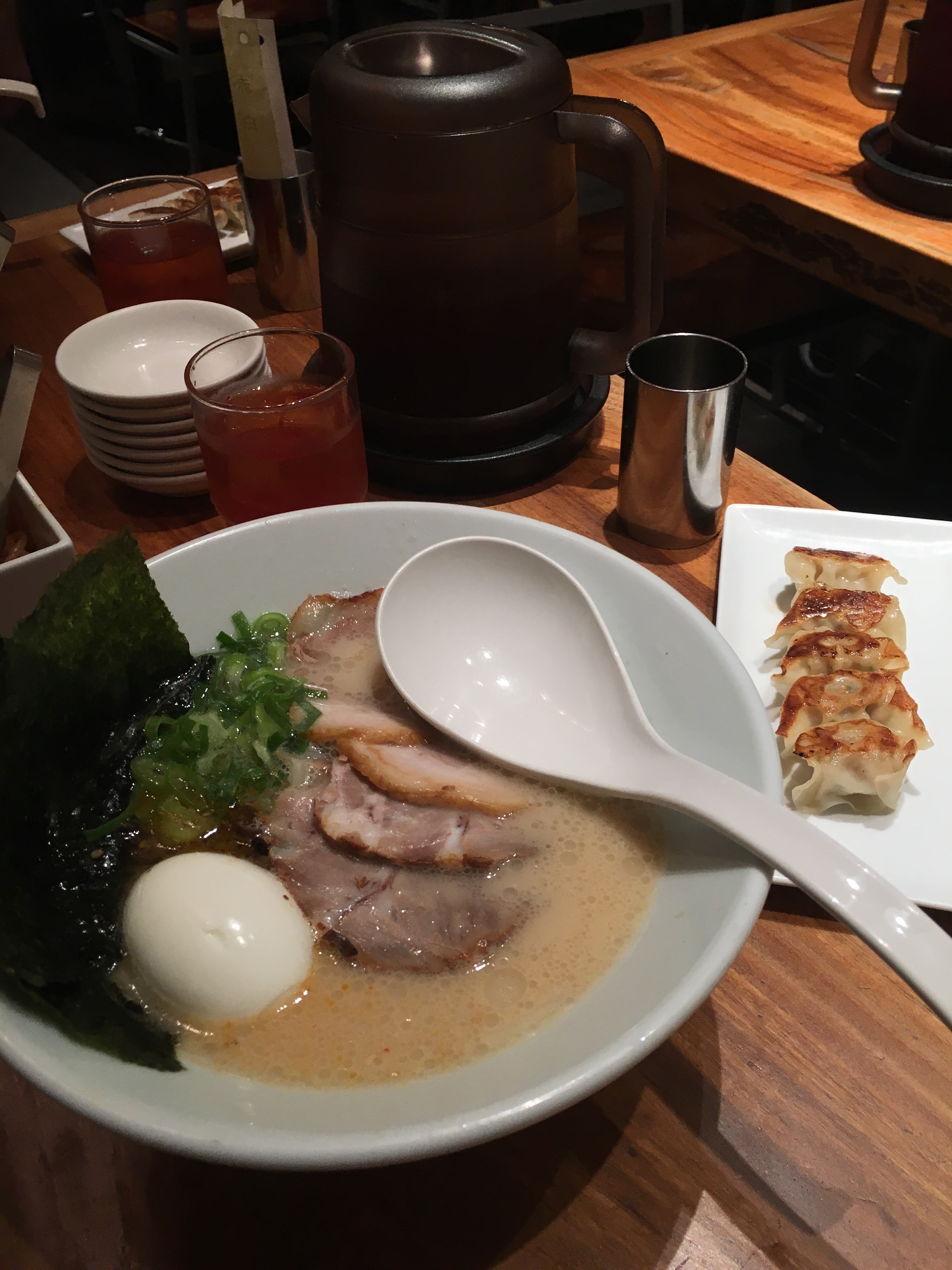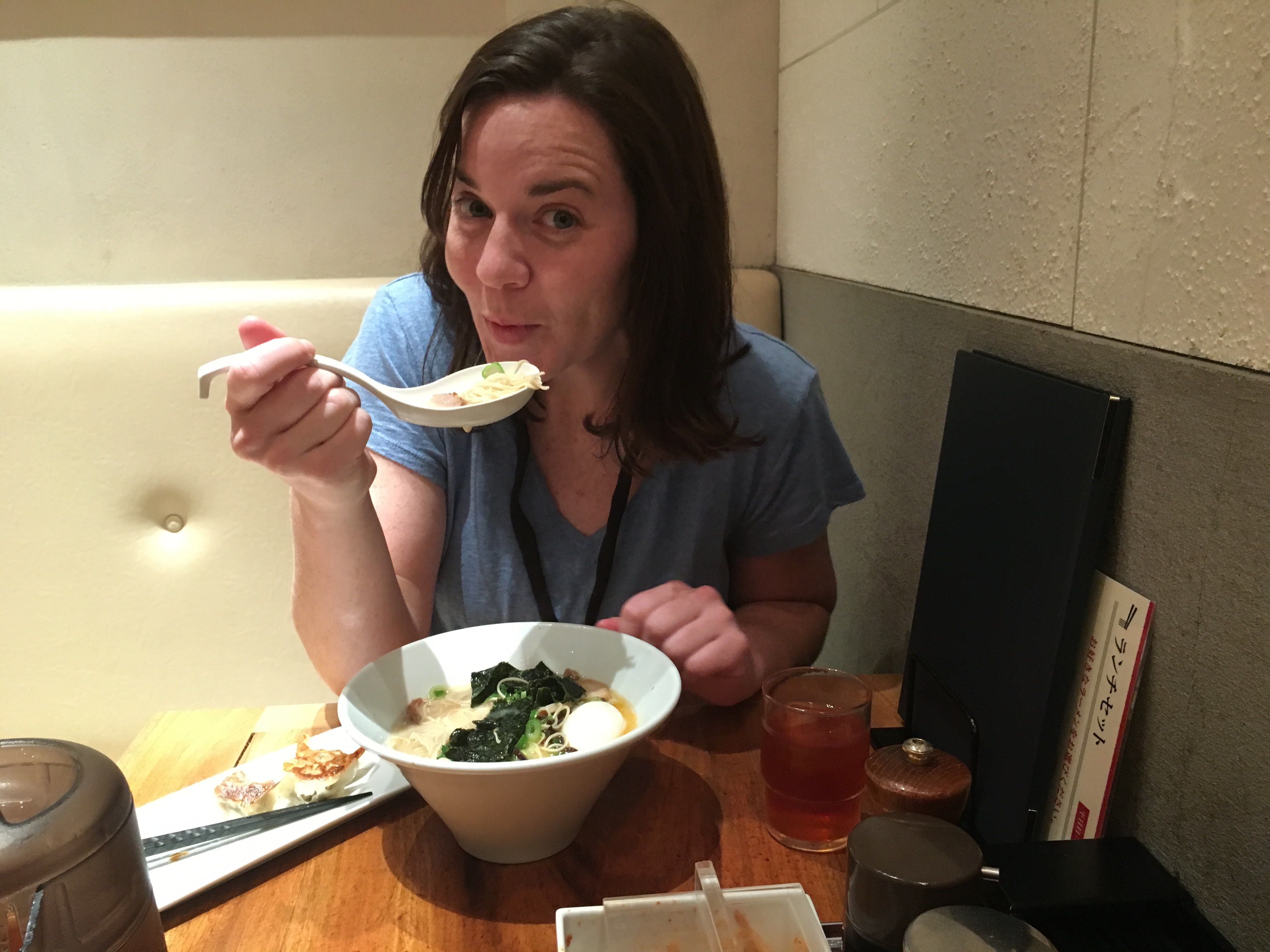 Lunchtime: We went looking for a yakatori (grilled things on sticks!) restaurant nearby in a multi-level food court, but couldn’t find it. What we did find was a tiny shop with about five or six stools filled with suited men leaned over steaming bowls slurping in front of a guy dishing out ramen – we gave up the yakatori search pretty easily after seeing that. Delicious! I got the classic, John got the spicy and some dumplings. All very good. The place only sat 16 people (6 tables – we had to split up the crew just to fit) plus the counter. The table was pre-set with a pitcher of some sort of tea – we’re still not sure what flavor it was but it was great. We were asked noodle firmness preference – she recommended al dente, and it was the right choice for sure. The egg yolk was bright orange, the broth creamy but not overly fatty, the strange condiments plentiful and men in suits sporting lobster-eating kind of bibs.