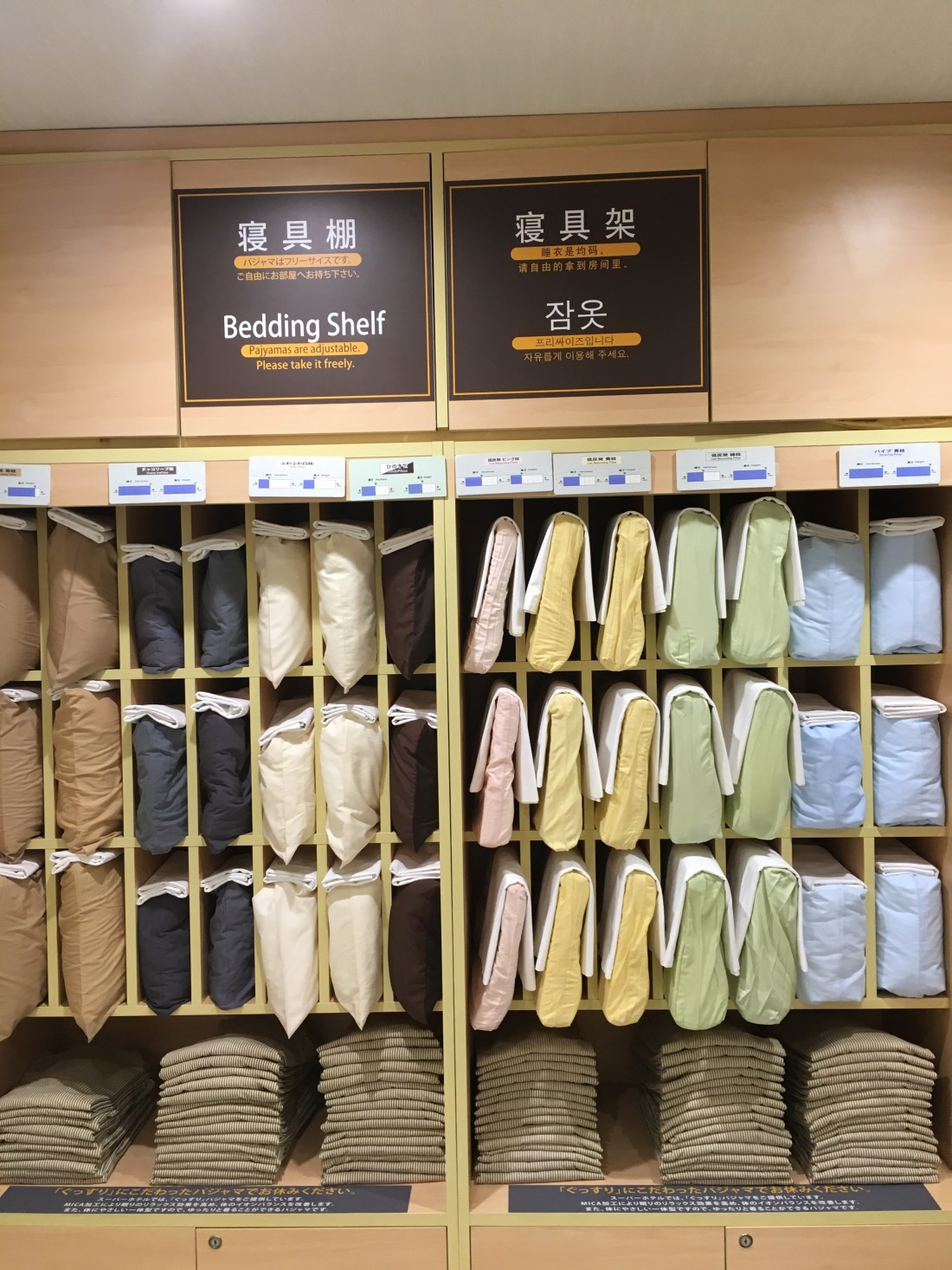 For the rest of our stay in Japan, we were at the Super Hotel! It was very no-frills, and the check-in is on the second floor – so when we walked in the door and were greeted by buttons and an elevator, for a shining moment we thought it was going to be a robot hotel! But then a woman came to check us in, womp. It was still an interesting experience – we got to choose the type of pillow we prefer and we all received a set of pajamas (a giant, button-up night shirt – same for male and female). The women (no men!) get to pick out five things from a case of beauty products per night (so Sarah and I got ten!). I mostly got some face masks, since I already had shampoo, soap, etc. It was a funny, random thing.
