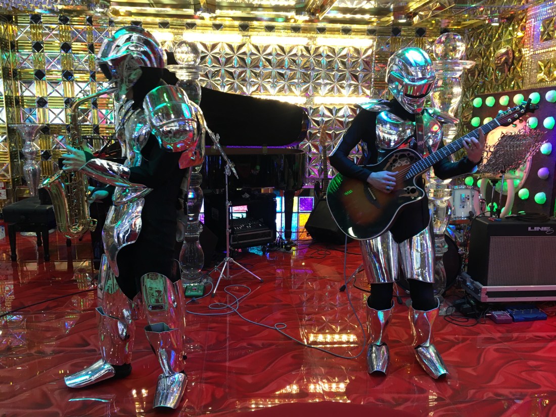 We made it to Robot Restaurant! You get your tickets across the street, and then led through this hallway mirror, up some loud, wacky stairs and into a waiting room that has gold shells for chairs, colors, mirrors, lights and chandeliers everywhere. There were two robot musicians playing jazz, the best Japanese toilet so far in the restroom, and …… YELLOW DORITOS.