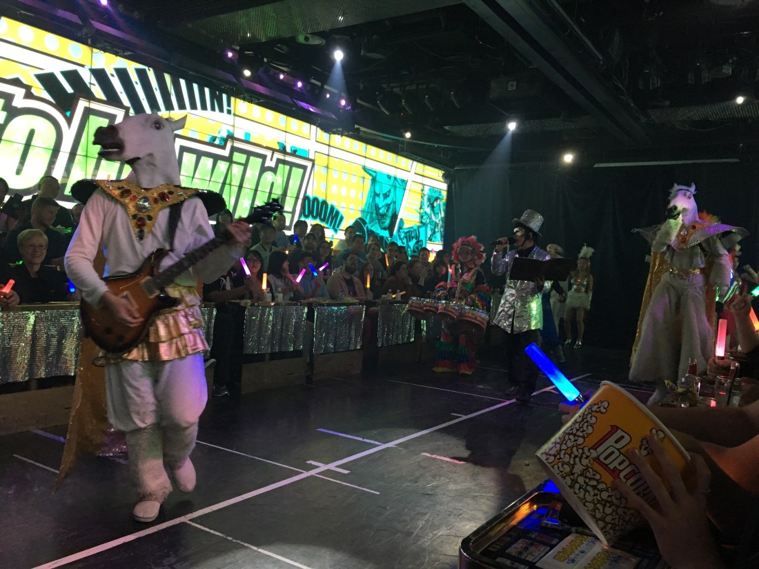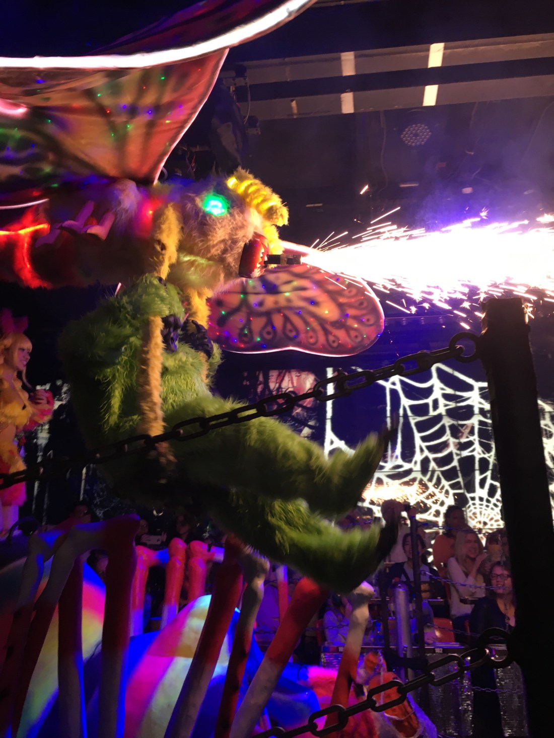 We hung out here for a while, until it was time for the show to begin. We were lead back downstairs to a large room with a runway down the middle. Turns out, we had front row seats. A ringleader instructed us to not touch the robots and to “make a dodge!” if something is heading your way. This is about the time I lose words to accurately describe the pure bonkers-ness of this experience. There is lasers, smoke and explosions. There are “savages” playing giant bongo drums, there is a whole story line where a race of robot aliens is trying to take over a peaceful planet of cute robot animal friends. A robot shark and monkey battled a robot alien mistress with lasers coming out of their mouth and eyes. There were breakdancers in trippy black lights, there were musical numbers and strange voice overs and at one point they bought out a chain fence and put it in front of us to contain the robots (??). There was also a strange zebra-ception vignette, where a zebra was carrying a blow up zebra on it’s shoulders while riding a robot zebra. I don’t think words can even do this place justice.