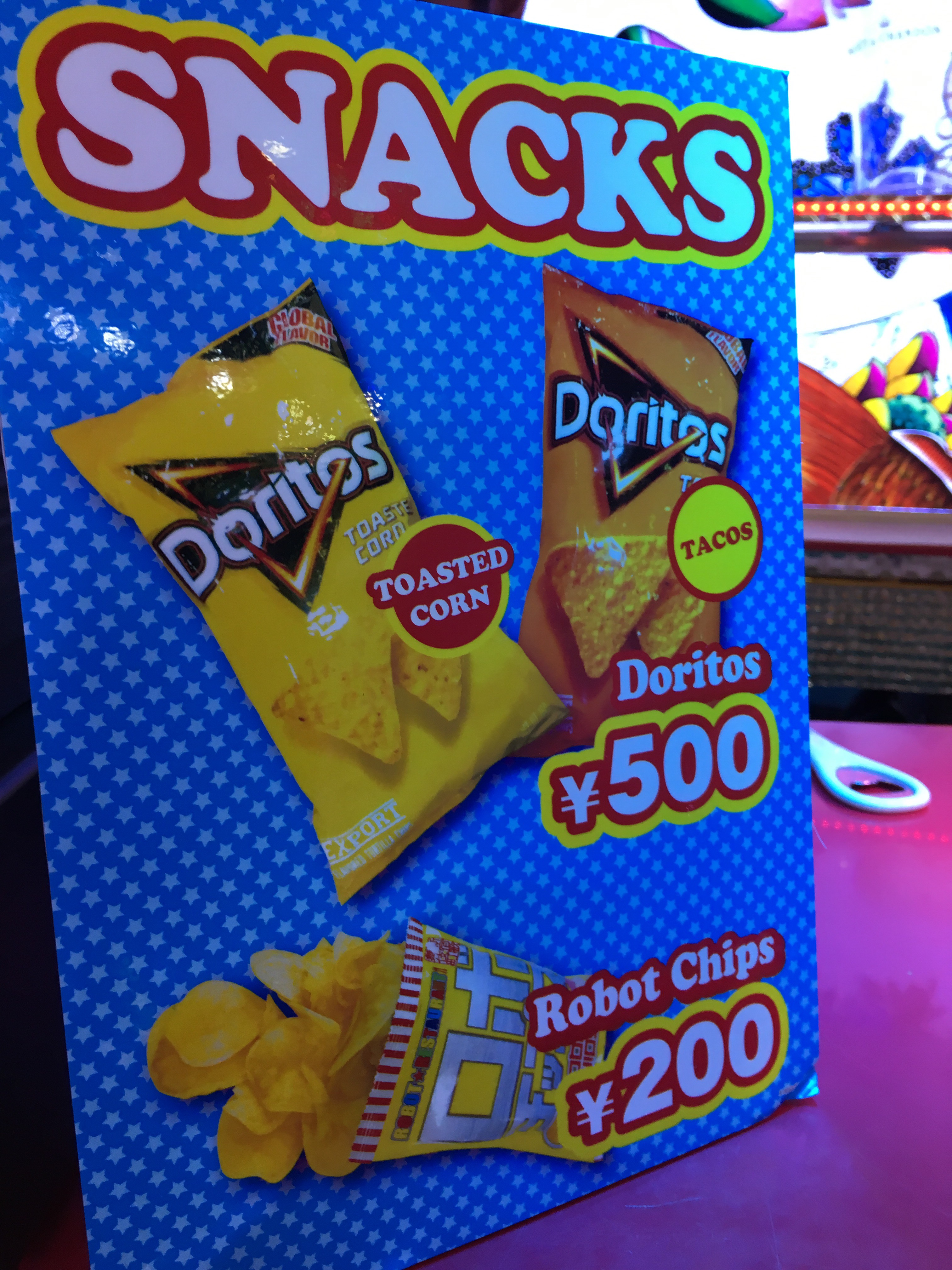 We made it to Robot Restaurant! You get your tickets across the street, and then led through this hallway mirror, up some loud, wacky stairs and into a waiting room that has gold shells for chairs, colors, mirrors, lights and chandeliers everywhere. There were two robot musicians playing jazz, the best Japanese toilet so far in the restroom, and …… YELLOW DORITOS.