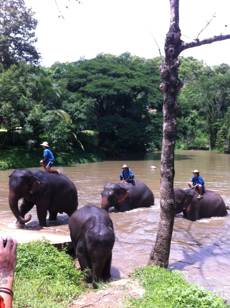 As soon as we left, it started to POUR. The massage places just pulled down some plastic and kept rubbing, and we were waiting under a tree right next to where we had just been, so my crazy lady masseuse invited us back under the tarp and had us sit down to wait it out. Then she randomly gave one of my arms a good massaging while she chattered away to us in Thai. It was…odd. But it felt good!